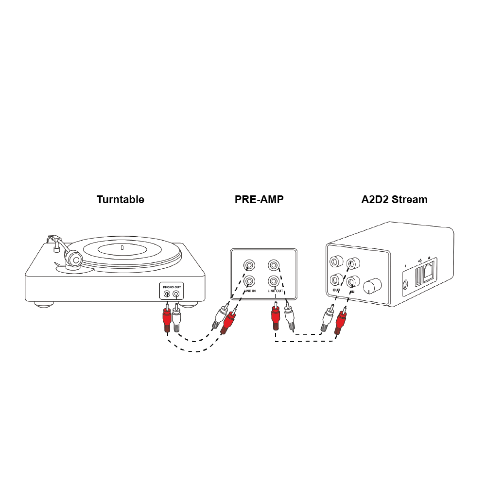 If your turntable doesn't offer a line-level output signal, and uses a phono connection, you'll need to connect a pre-amp between your turntable and A2D2 Stream like so: