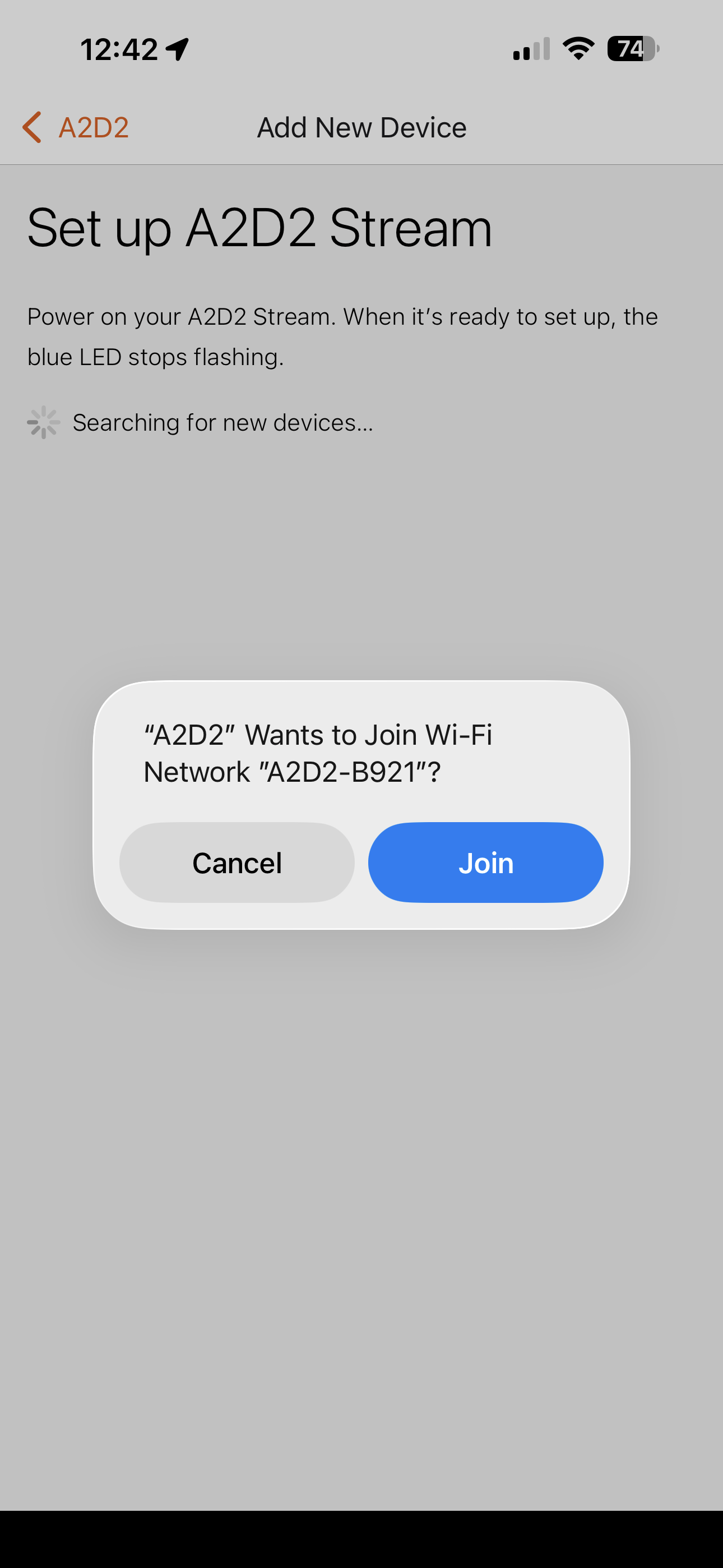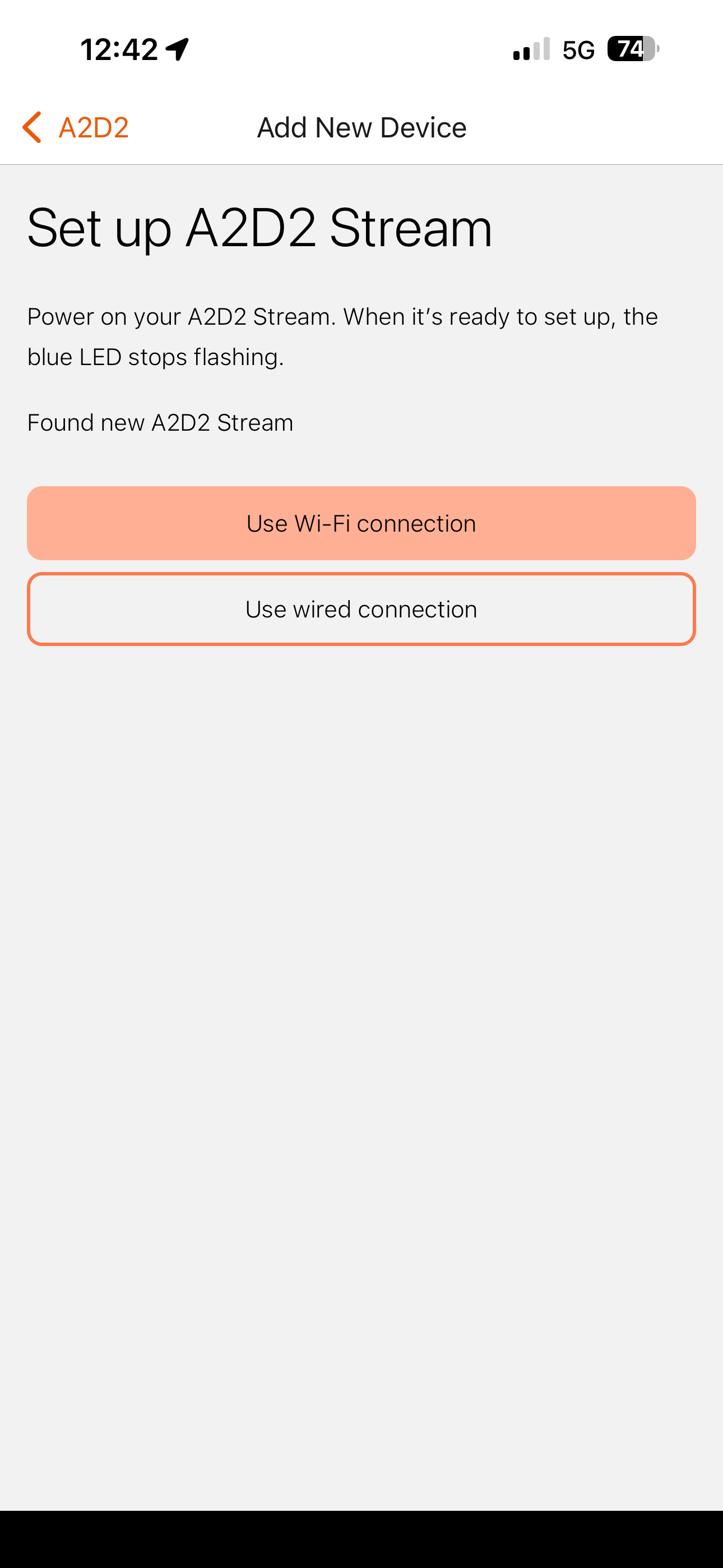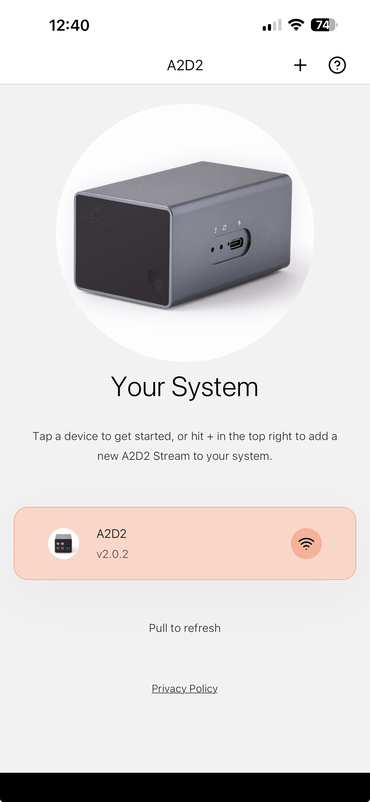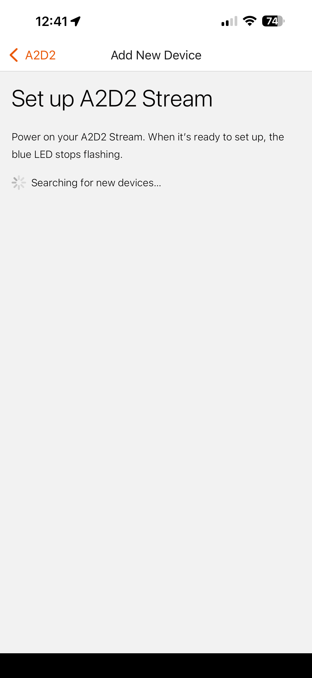 Una vez que el LED azul deje de parpadear, la unidad estará lista y conectada a tu red WiFi. Ve a “Dispositivos” en la app y toca el A2D2 Stream recién detectado, ¡y listo! Si tu A2D2 Stream no aparece la primera vez, es posible que necesites reiniciar tu A2D2 Stream o tu router doméstico – algo llamado DNS, que asigna direcciones a dispositivos y ordenadores, puede quedar almacenado en caché en algunos modelos de router.