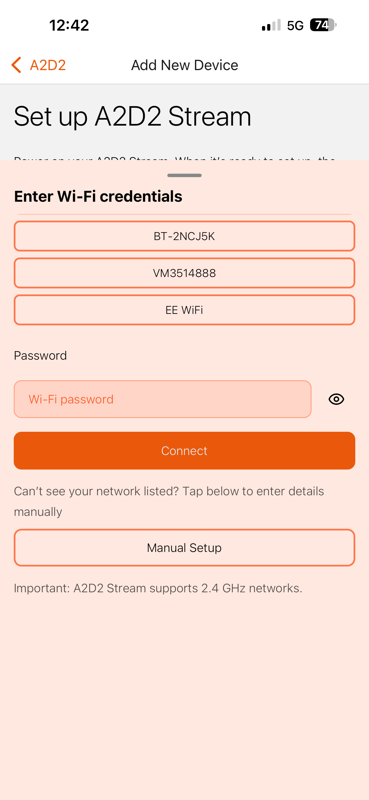 Abre la aplicación, toca “Añadir nuevo dispositivo” y nuestra app descubrirá cualquier dispositivo A2D2 Stream que esté esperando configuración. Tu teléfono te pedirá unirte a la red de A2D2 Stream. Debes permitirlo para que la app pueda comunicarse con tu dispositivo. Verás que la opción “Red WiFi actual” se actualiza al encontrar tu dispositivo. Si tu dispositivo no encuentra la red, puedes unirte manualmente. Se llamará A2D2-xxxx, donde x es único. La contraseña es 123456789 – conéctate a la red desde tu teléfono y vuelve a la aplicación.